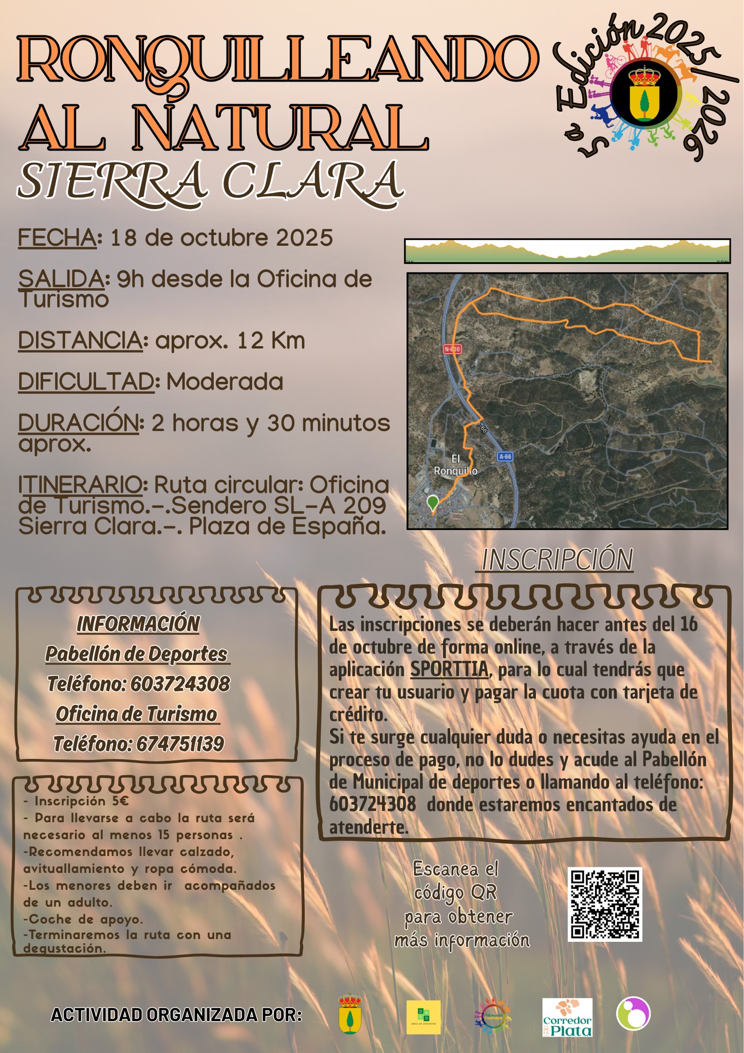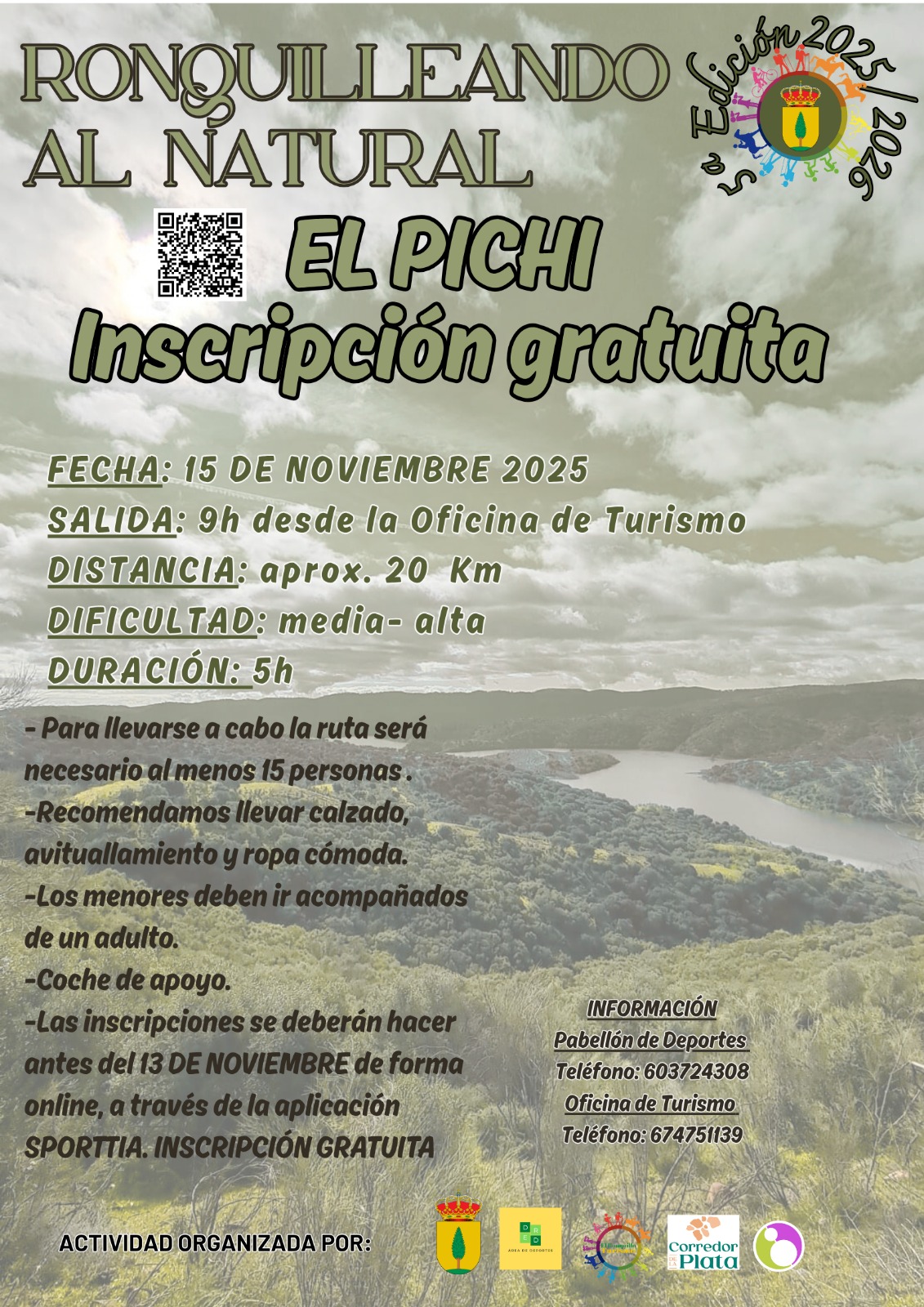 El Ayuntamiento de El Ronquillo te anima a participar en la jornadas de senderismo de su programa «RonquilleAndo al Natural». En la temporada 2025-2026 estamos desarrollando la quinta edición de este exitoso programa organizado por el área de turismo y el área de deportes del ayuntamiento: